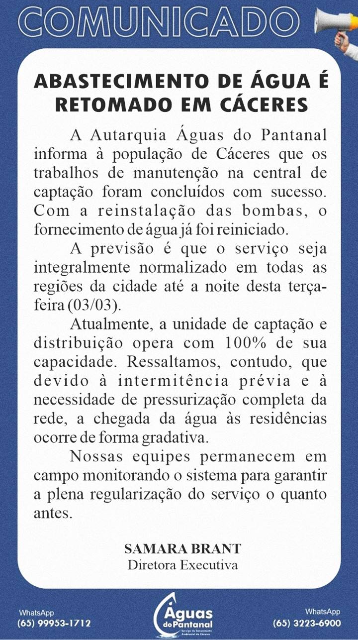 A Autarquia Águas do Pantanal informa à população de Cáceres que os trabalhos de manutenção na central de captação foram concluídos com sucesso.