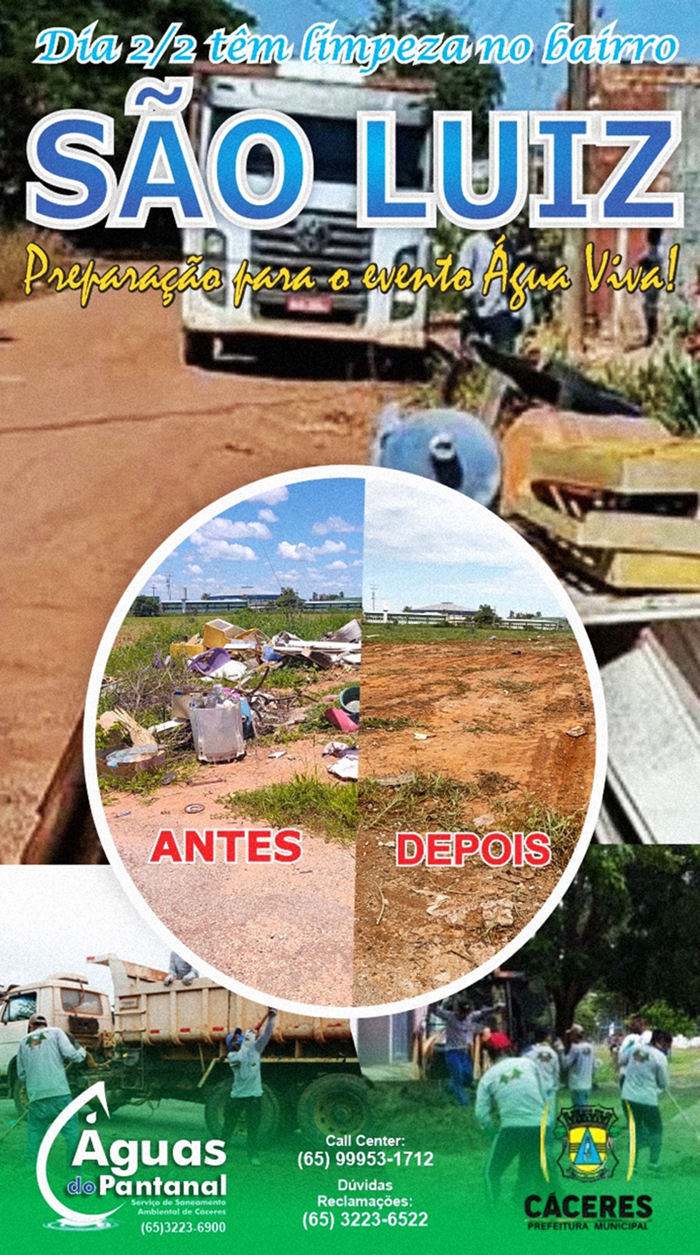 A autarquia Águas do Pantanal inicia, nesta segunda-feira (2 de fevereiro), uma grande operação de limpeza no bairro São Luiz. A ação atende a uma solicitação da direção da Igreja Nossa Senhora Aparecida e visa preparar a região para o "Água Viva", evento católico que será realizado entre os dias 14 e 17 de fevereiro, em frente à paróquia local.
