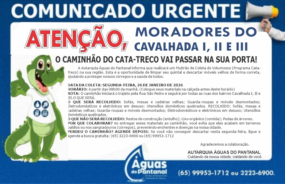 A Autarquia Águas do Pantanal informa que realizará um Mutirão de Coleta de Volumosos (Programa Cata-Treco) na sua região. Esta é a oportunidade de limpar seu quintal e descartar móveis velhos de forma correta, ajudando a proteger nossos córregos e a saúde de todos.