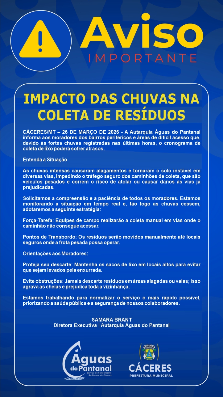 CÁCERES/MT – 26 DE MARÇO DE 2026 - A Autarquia Águas do Pantanal informa aos moradores dos bairros periféricos e áreas de difícil acesso que, devido às fortes chuvas registradas nas últimas horas, o cronograma de coleta de lixo poderá sofrer atrasos.