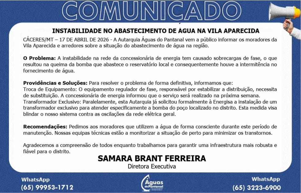 CÁCERES/MT – 17 DE ABRIL DE 2026 - A Autarquia Águas do Pantanal vem a público informar os moradores da Vila Aparecida e arredores sobre a situação do abastecimento de água na região.