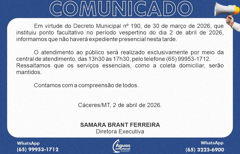O atendimento ao público será realizado exclusivamente por meio da central de atendimento, das 13h30 às 17h30, pelo telefone (65) 99953-1712.Data: 02 de Abril de 2026