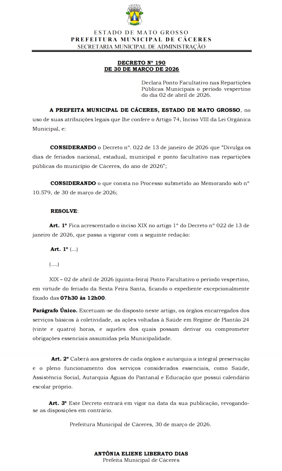 Em virtude do Decreto Municipal nº 190, de 30 de março de 2026, que instituiu ponto facultativo no período vespertino do dia 2 de abril de 2026, informamos que não haverá expediente presencial nesta tarde.